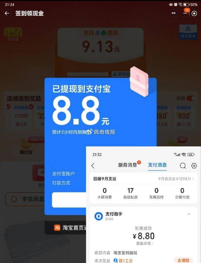 淘宝 首页-鸿包签到 自动弹出ti.现界面 点一下抽 反馈有8.8 常用和不常用都试试看