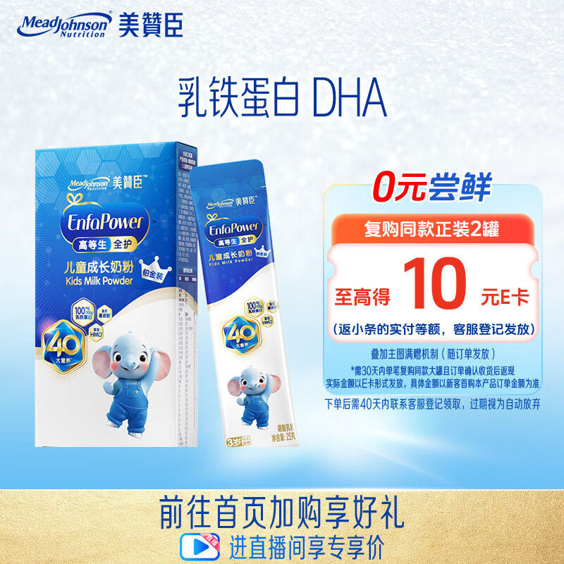 20点留意变价1 美赞臣高等生全护儿童奶粉铂金装25gX3条