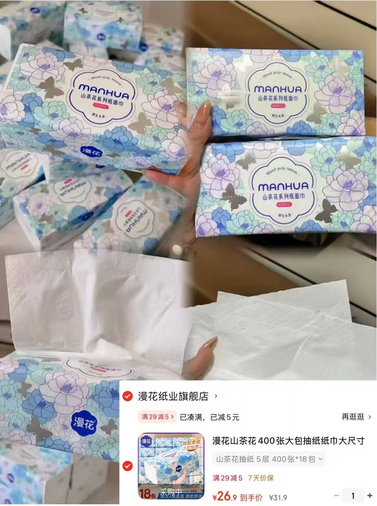 抢‼漫花山茶花柔韧抽纸26.980抽*18大包‼⚠1.4/包 平时一包4块多拍