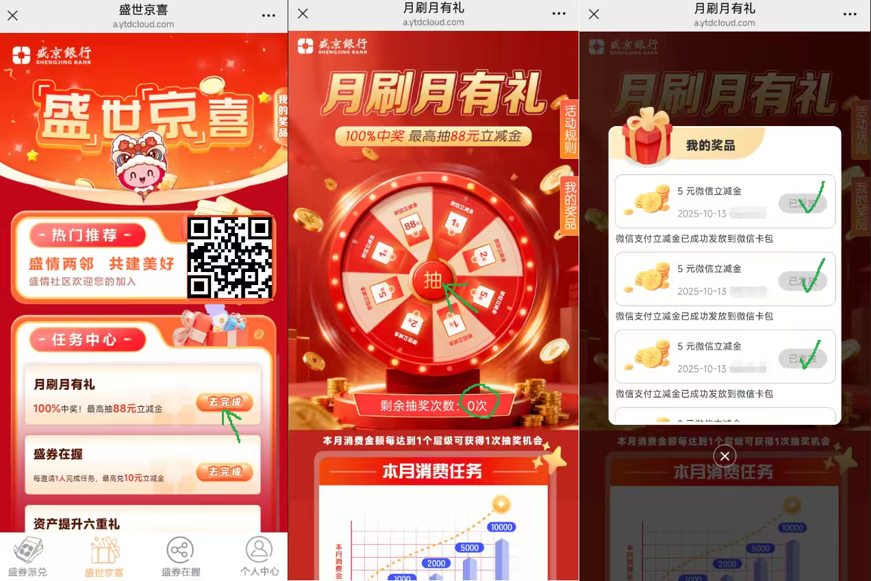 盛京储蓄卡活动,微信识别图中二维码跳转链接,点月刷月有礼。余额宝或零钱通累计充1万就算达标。达标2日后给5次抽奖次数。必中立减金。(看不到活动的用户不受邀)