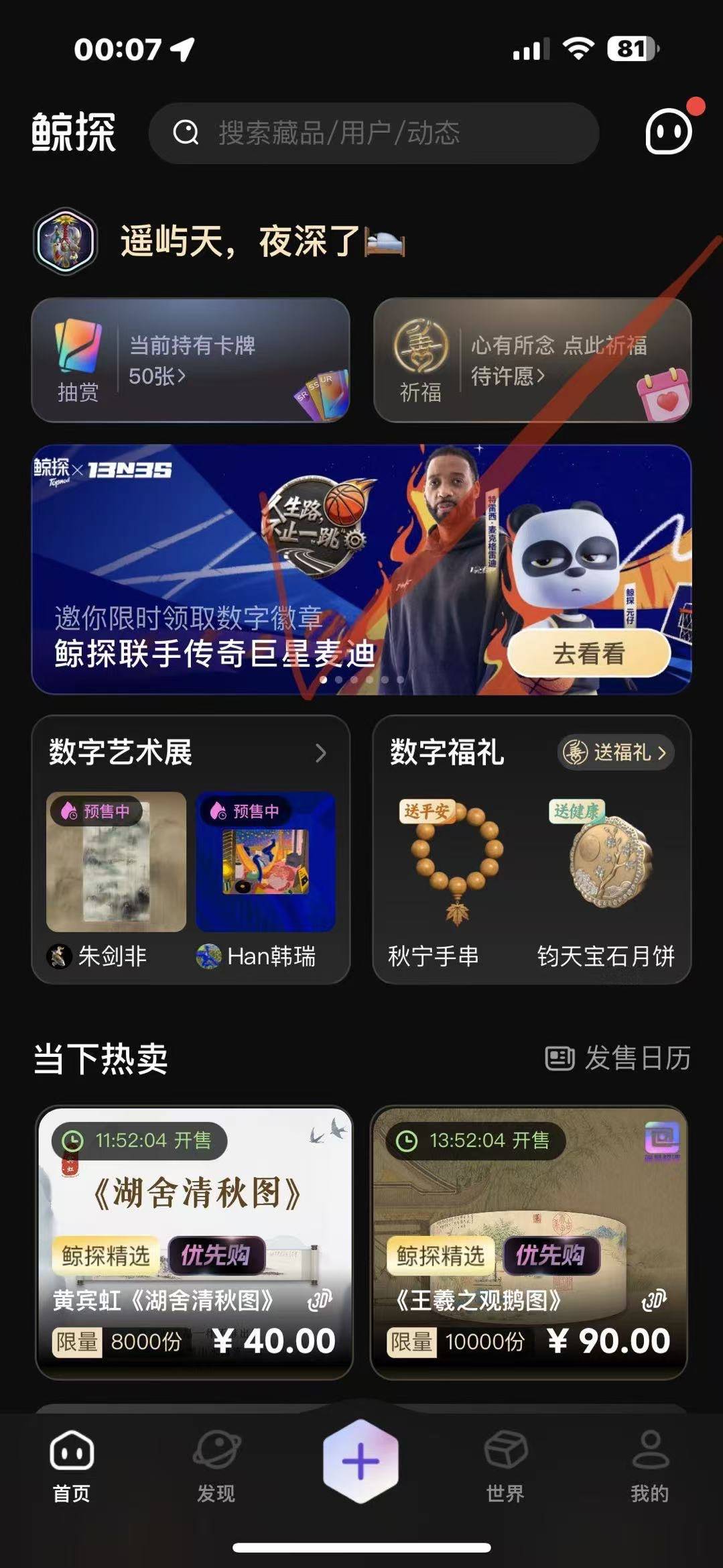 支付宝搜索鲸探,进首页横幅领数字藏品