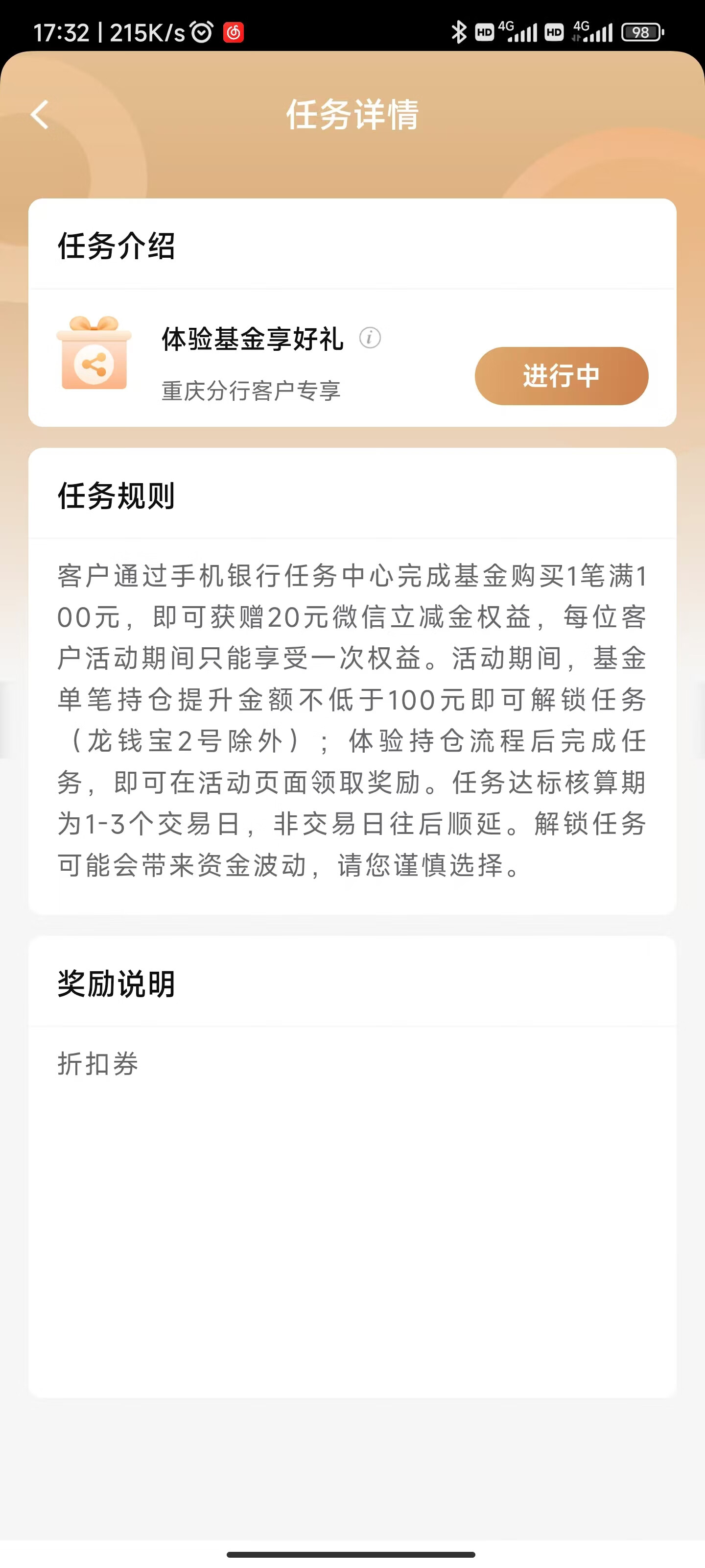 如图,建行任务中心,做任务享好礼,买100基金(怕市场波动大的,买债券基金)即可完成任务。好用分享!!!
