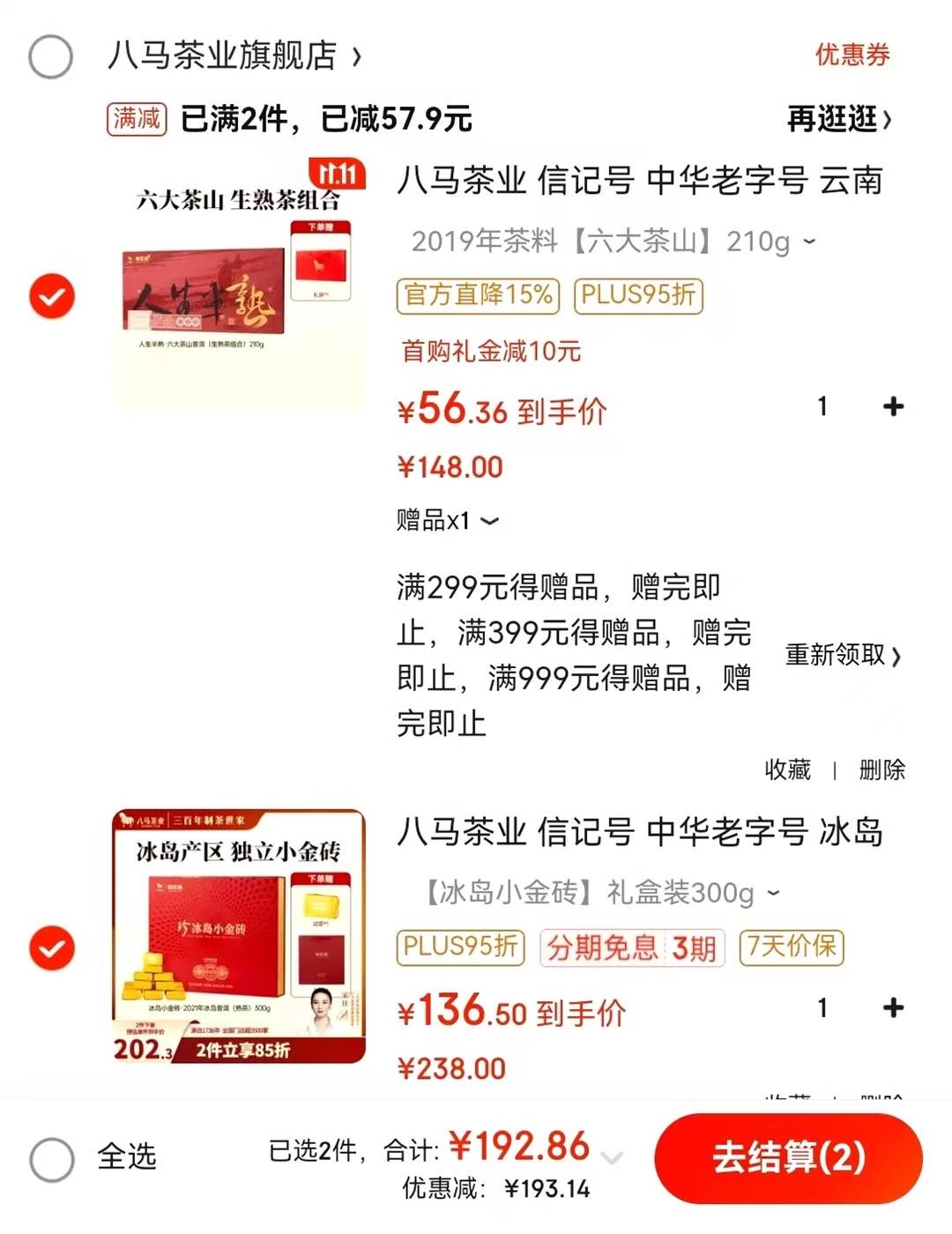 捡屚忦!八马茶礼盒Plus领9折补贴券https://u.jd.com/parB0kY再领2张补贴券https://kzurl17.cn/7W8YrFhttps://kzurl17.cn/7W8YrM拍1! 普洱小金砖300ghttps://u.jd.com/p1rE3HR拍1! 普洱熟茶210ghttps://u.jd.com/pDryy55——————♦192.8亓! 赠品鉴茶38g*才折小金砖136!熟普56*这忦速屯了!送礼或自喝