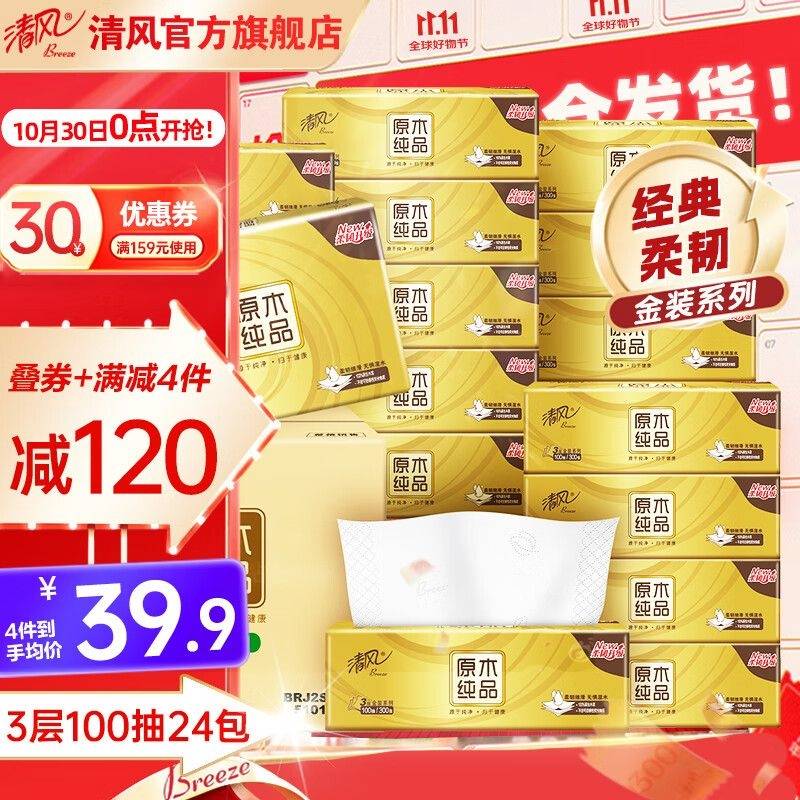 抽纸特价先领券https://u.jd.com/pGPowGw清风 金装原木纯品抽纸190*132mm3层100抽24包https://u.jd.com/pa0OiqM——拍4件91.6元❤️新客再减4元低至0.91元/包邮[惊恐]跌破1元了