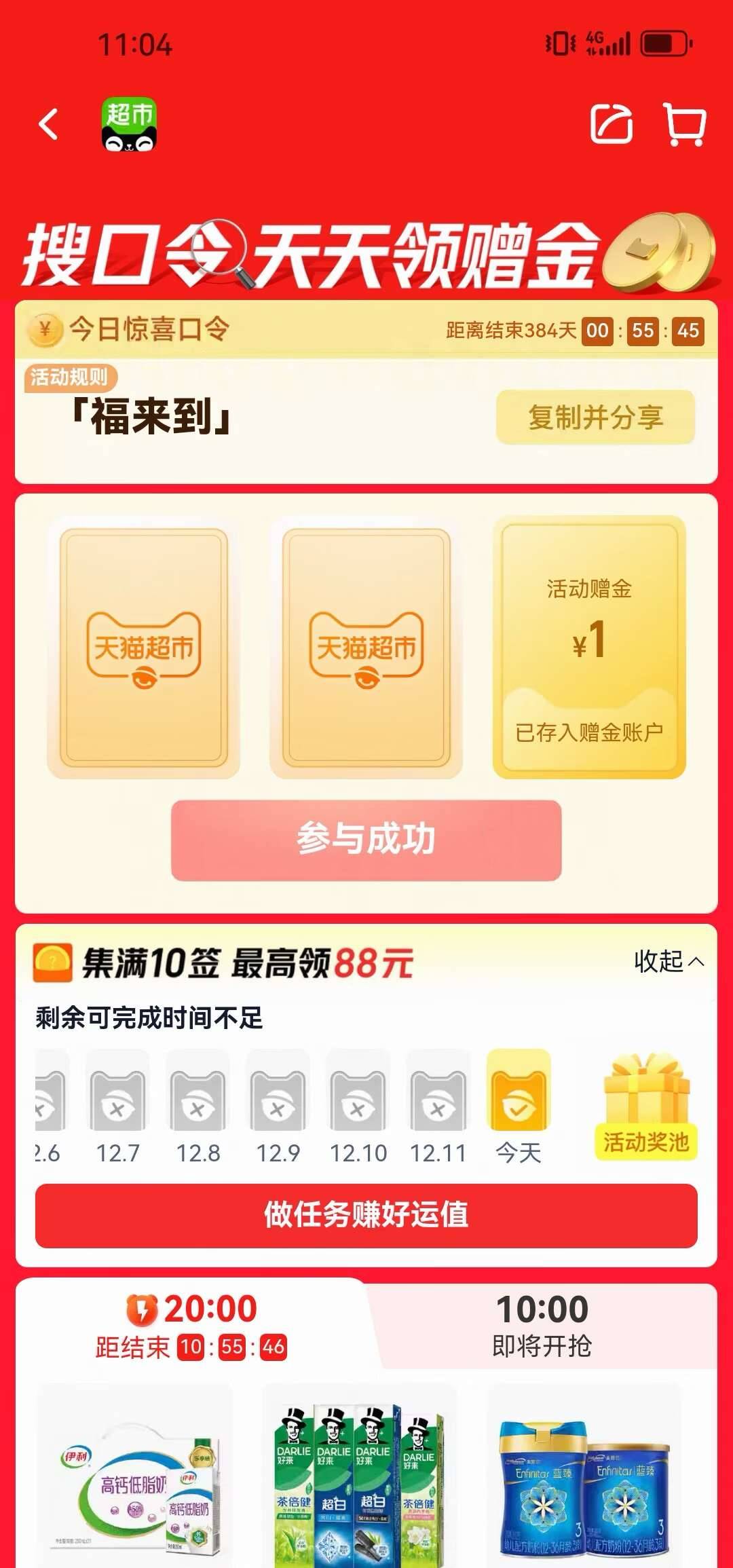 天猫超市搜 福来到 目前还有1块今日没有领的速度哈❗️