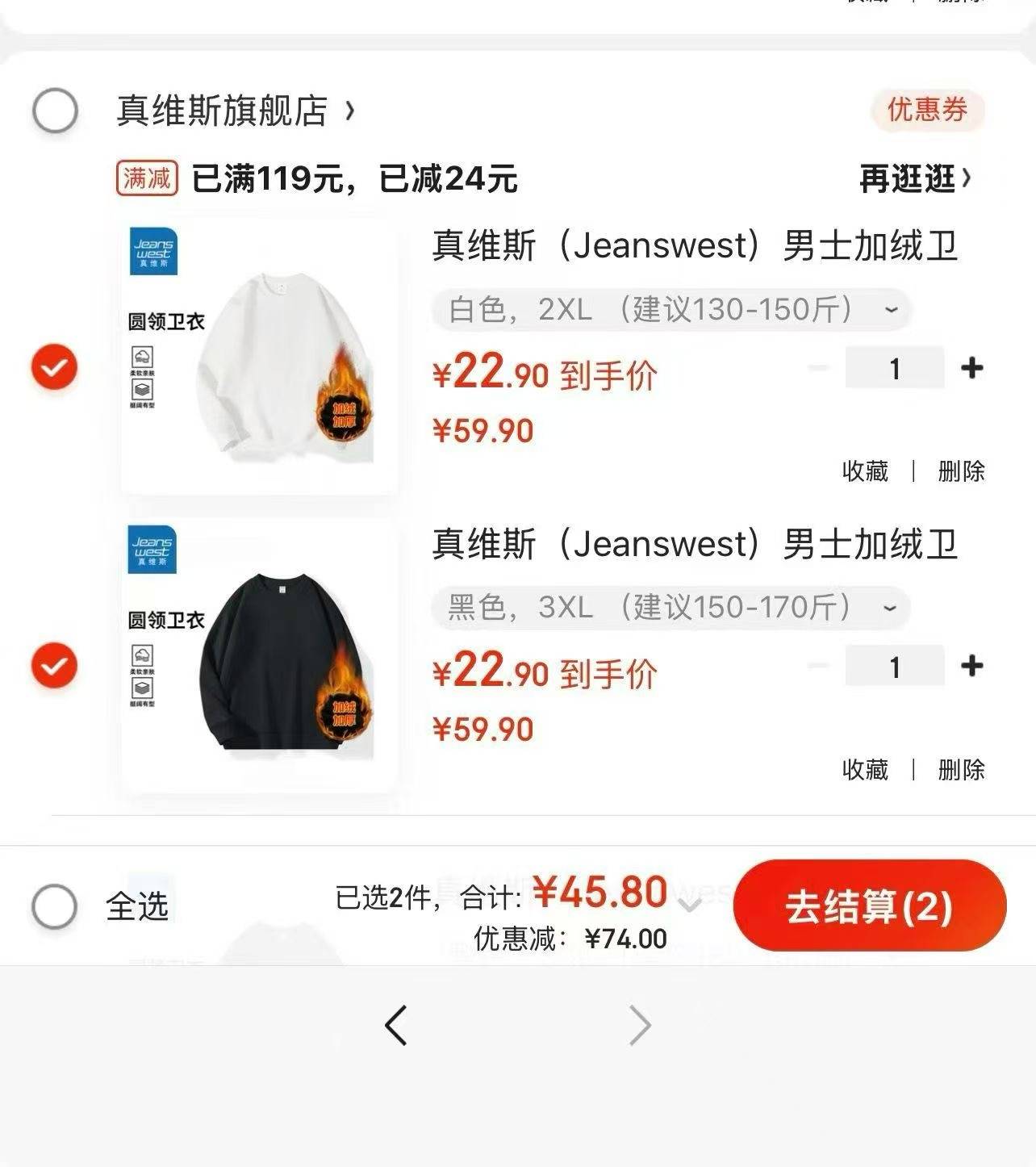 快‼️真维斯加绒卫衣神价了任选 2 件真维斯加绒卫衣https://u.jd.com/ZOAxQVJ到手 45.8 元 折单件 22.9 元
