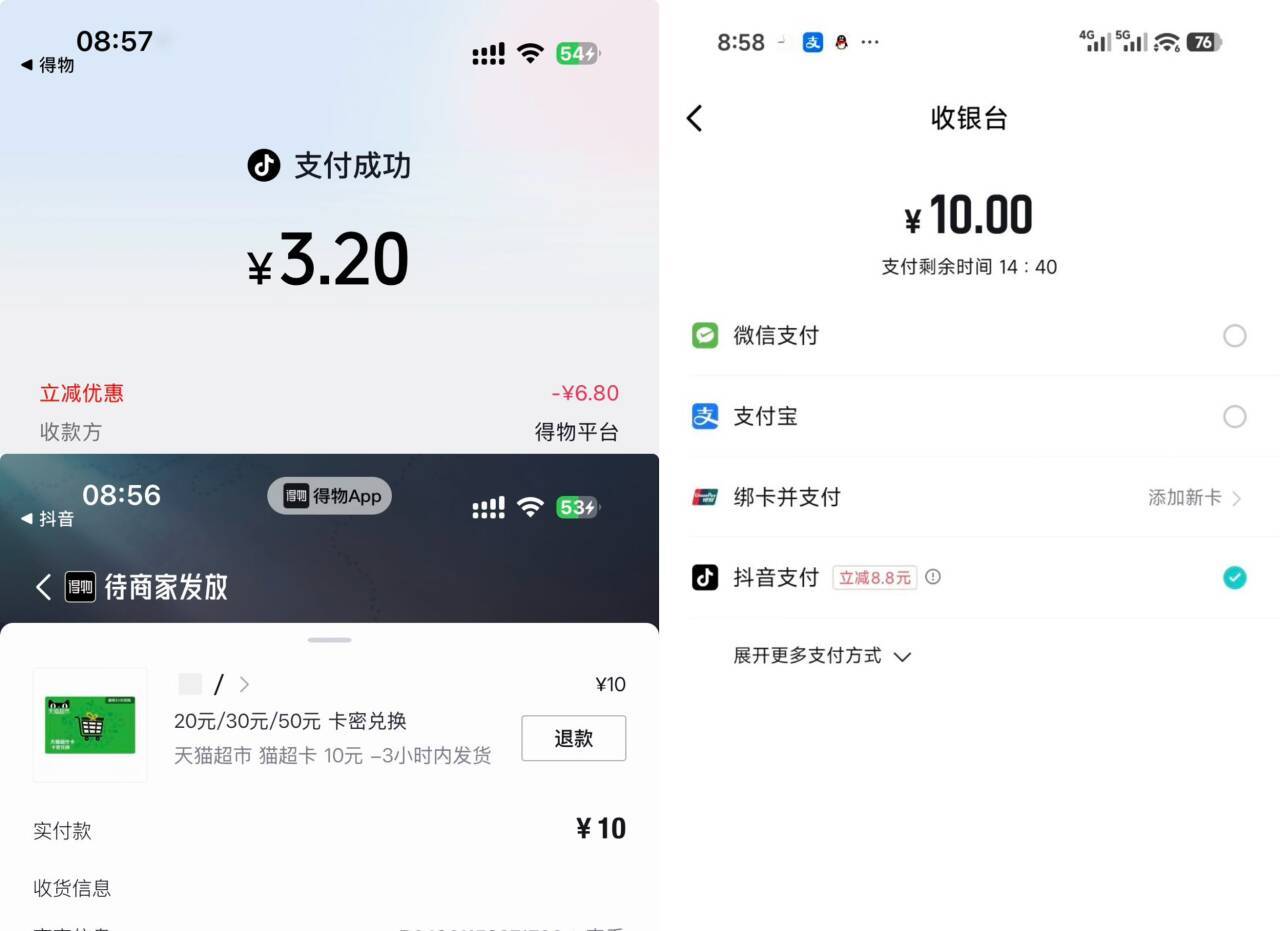 得物搜 天猫超市卡选择dy支付有-8.8,没有的就随便选个别付钱,到订单里在找dy支付没有就先提交 不付款去订单里看随便选个支付方式提交订单不付款 再去订单里 就有dy支付了没有dy支付去更新得物app更新后部分会有