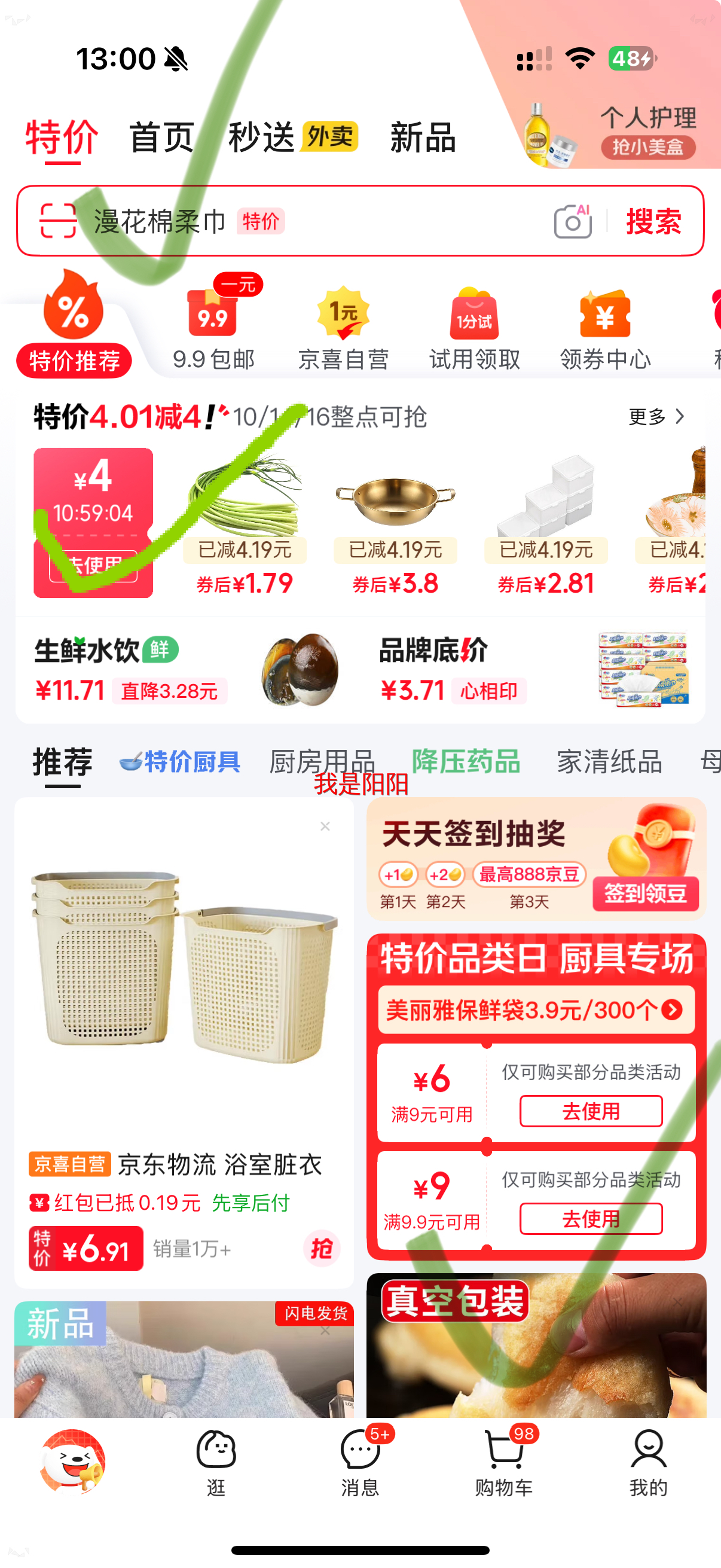 十点整,京东app特价-特价推荐,领4-4下面的9.9-9领了(下午出作业)