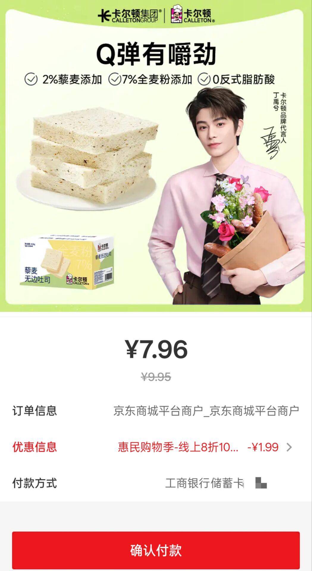 JD自营 卡尔顿 藜麦无边吐司面包420ghttps://u.jd.com/ZDjoKiJ——9.95元+运费❤️有国补7.96元结算到最后用云.闪付支付就对了