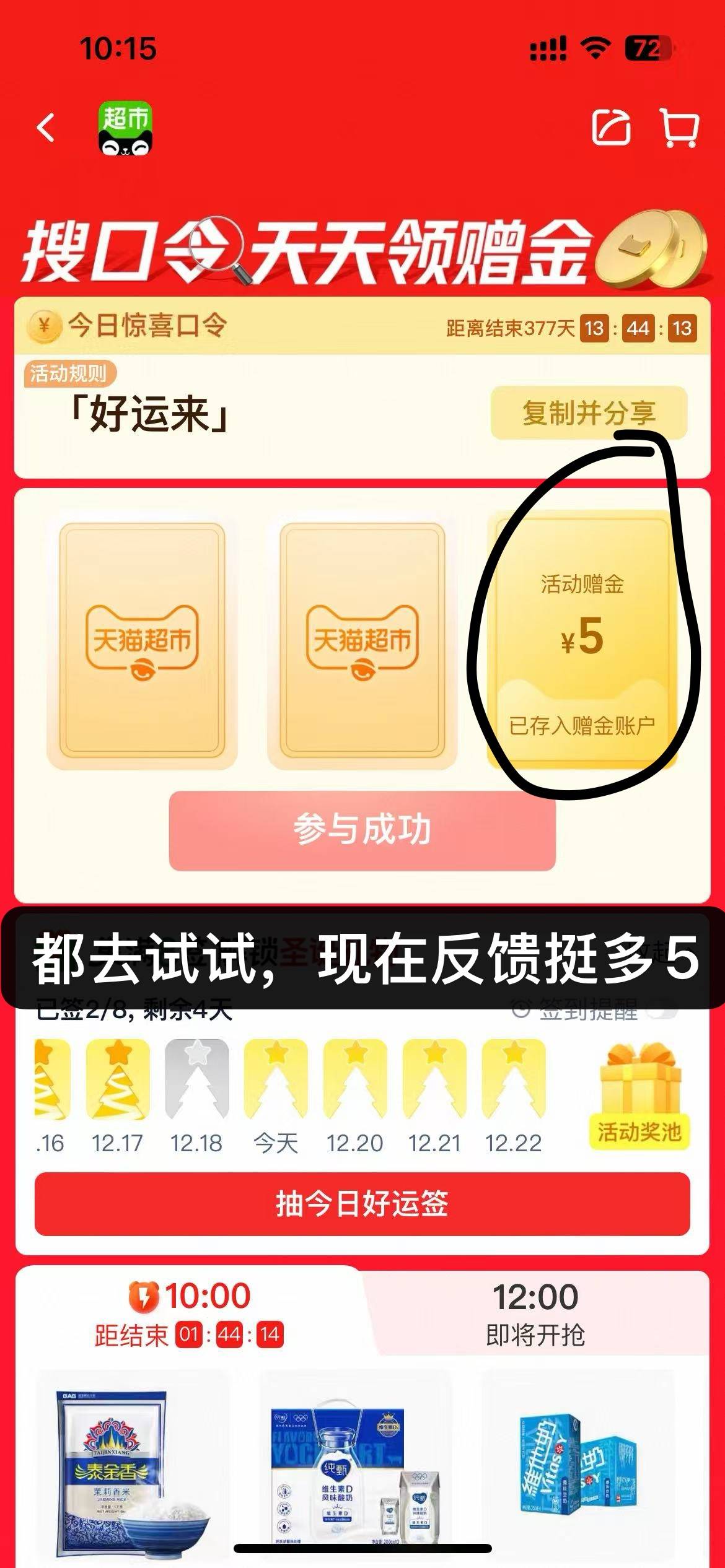 淘宝-天猫超市搜:好运来现在必中1/2/5 记得领后面有用