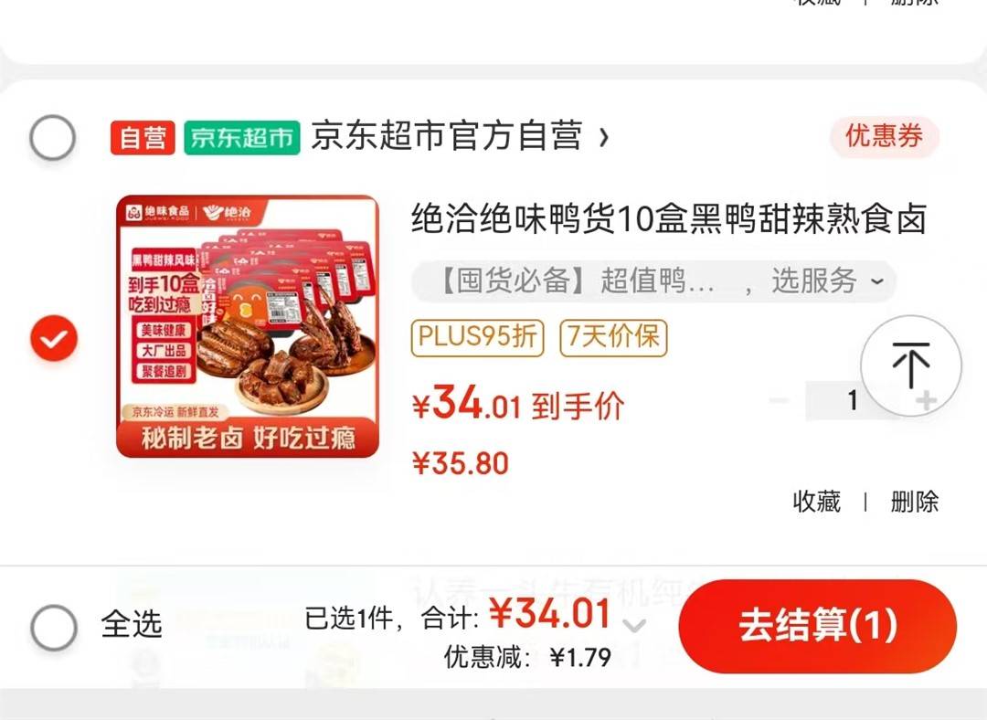 捡漏忦!有货的速度了绝味 鸭货卤味10盒鸭脖*4+鸭翅中*3+鸭锁骨*3https://u.jd.com/ZGhzKw3——————♦plus34亓!才3.4/盒*前几天发的69!屯点吃
