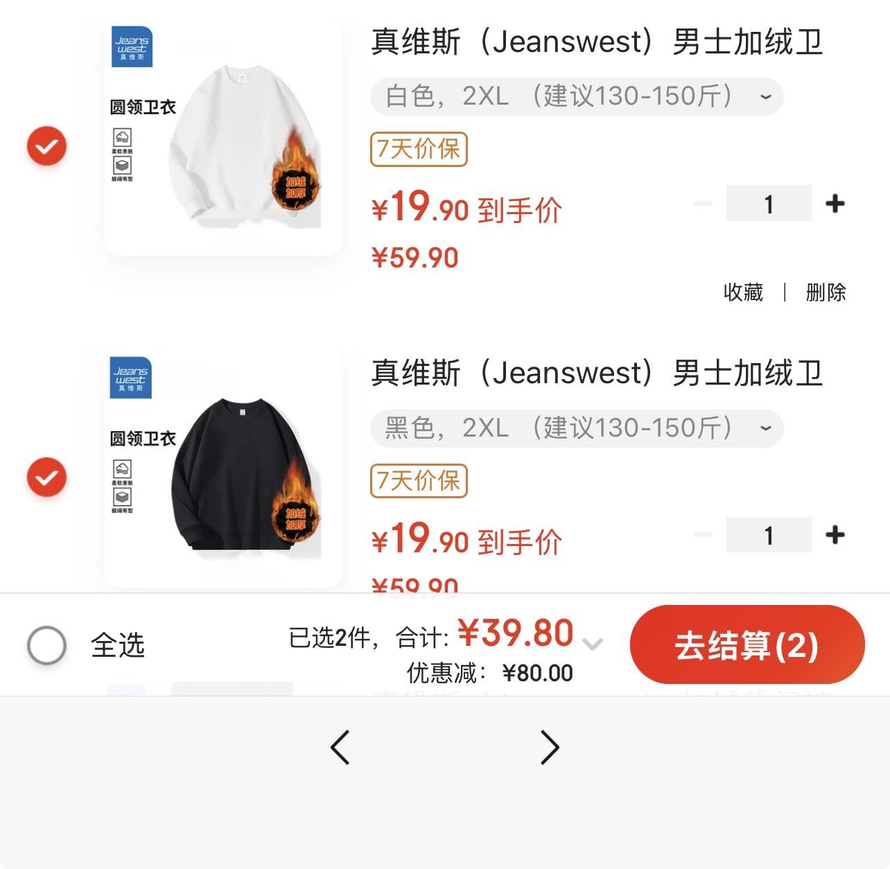 快‼️真维斯加绒卫衣神价了任选 2 件真维斯加绒卫衣https://u.jd.com/ArOxGeM到手 39.8 元 折单件 19.9 元