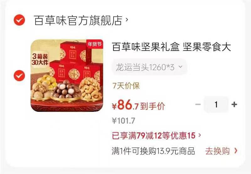 百草味 龙运当头坚果礼盒 1260g86.73箱;折28.9/箱领