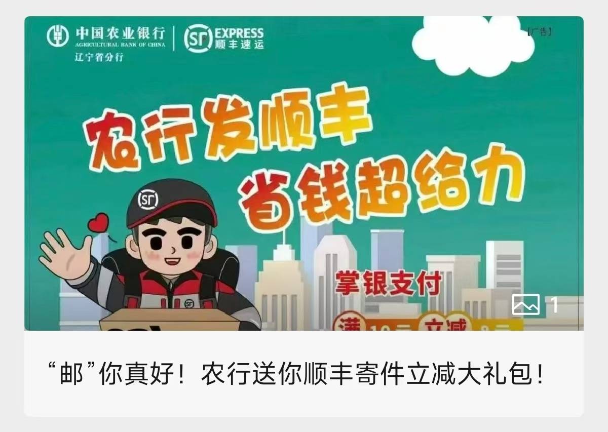 辽宁农行62开头银联储蓄卡或信用卡2026年3月邮顺丰快递手机银行APP扫码支付 单笔运费满10元立减8元 满20元立减16元 月各一次 每日早8点更新名额 自用非常合适