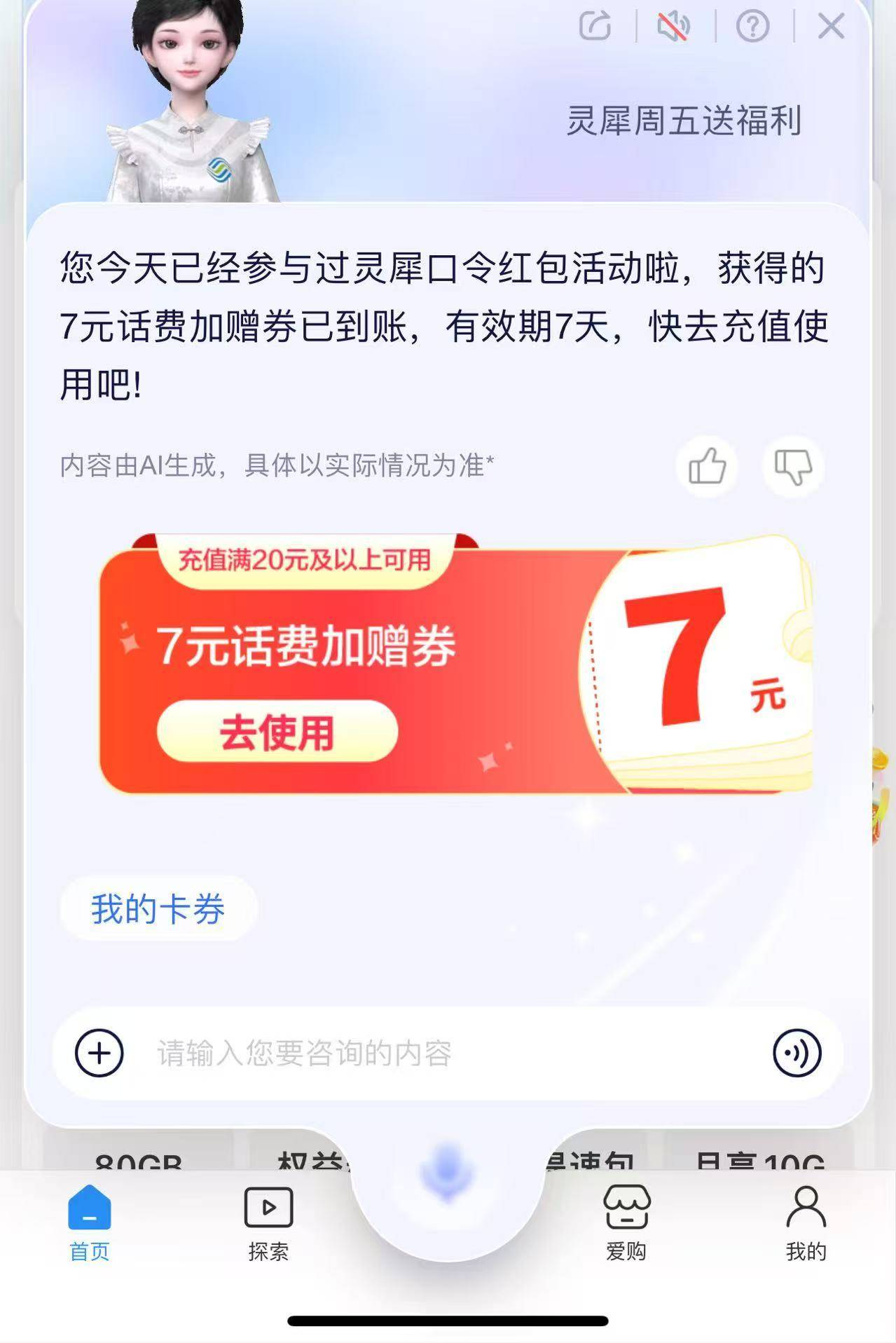 移动app-底部中间-灵犀AI助手 发送:灵犀周五送福利7元话费