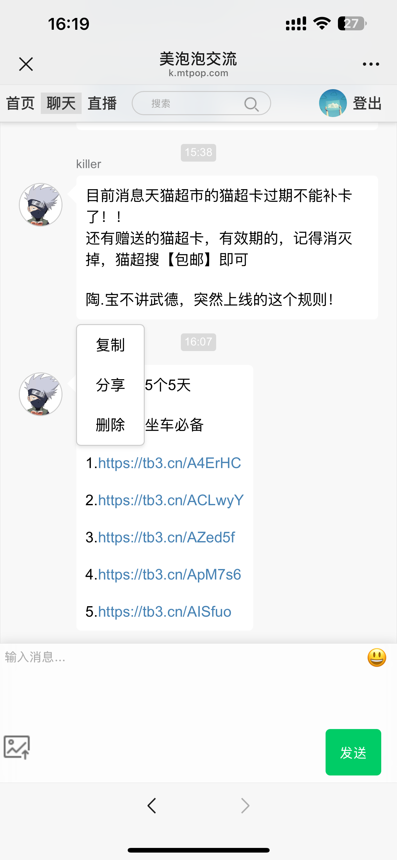 类似微信长按效果 这里改成双击还有发线报很方便 登陆后 输入线报内容 上传图片 一点就能发送 没有那么繁琐 和你聊天一样我希望能聚集一波人用这个网站 我也有动力不断更新功能 相对于传统发帖的网站 这种方便太多了 但是主要还是有人愿意用希望有愿意分享的线报大牛愿意入住网站每天至少有几千IP访问所以你发的内容还是有很大曝光量的网站允许发 1. 纯线报2.邀请双方有利线报 允许首发3. 粗暴人头 允许首发 需要注明人头4. 购物类线报 允许发真实bug 可以带自己联盟希望可以有朋友愿意在上面分享加入的也可以进群 有问题可以反馈